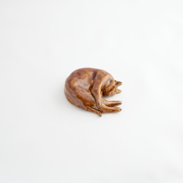 丸まって眠る猫。 手捻り、あめ釉。 【素材】 陶器 【サイズ】 約 8cm × 6.5cm × 高さ 2.5cm ※ブラウザ環境や撮影時の光の加減により色合いや濃淡が実物と違って見える場合があります。予めご了承下さい。 【領収書について】 BASEでは請求書や領収書の発行を行っておりません。領収書の発行をご希望の方は備考欄にてお知らせください。