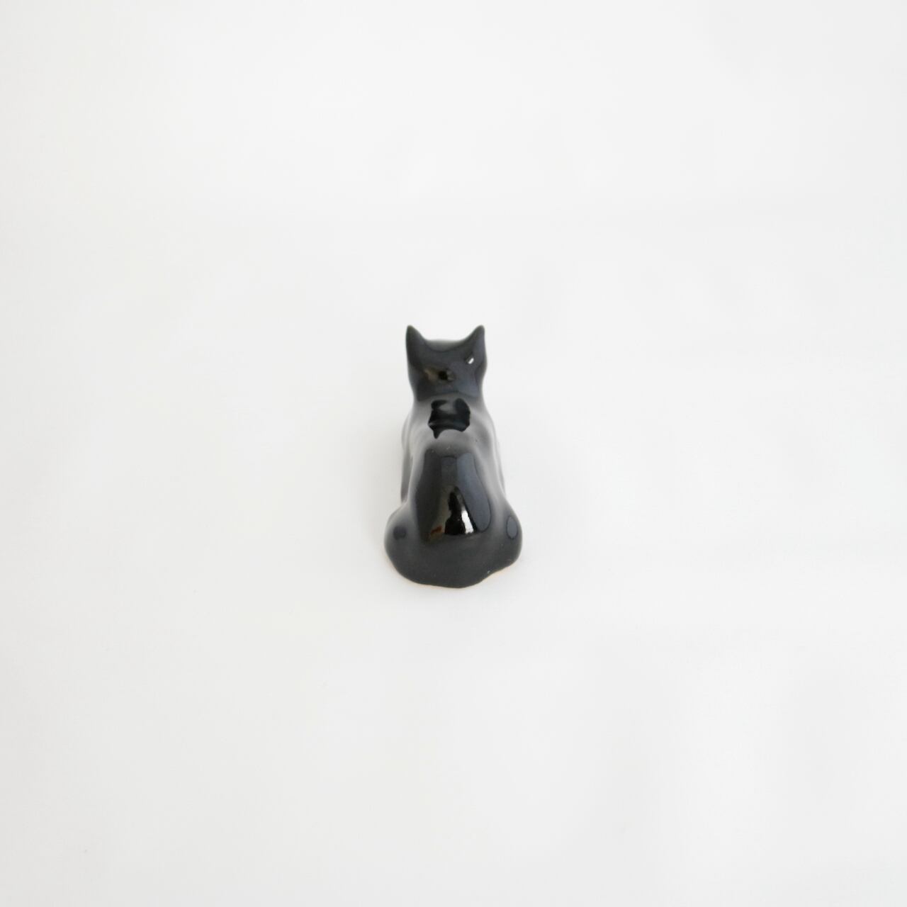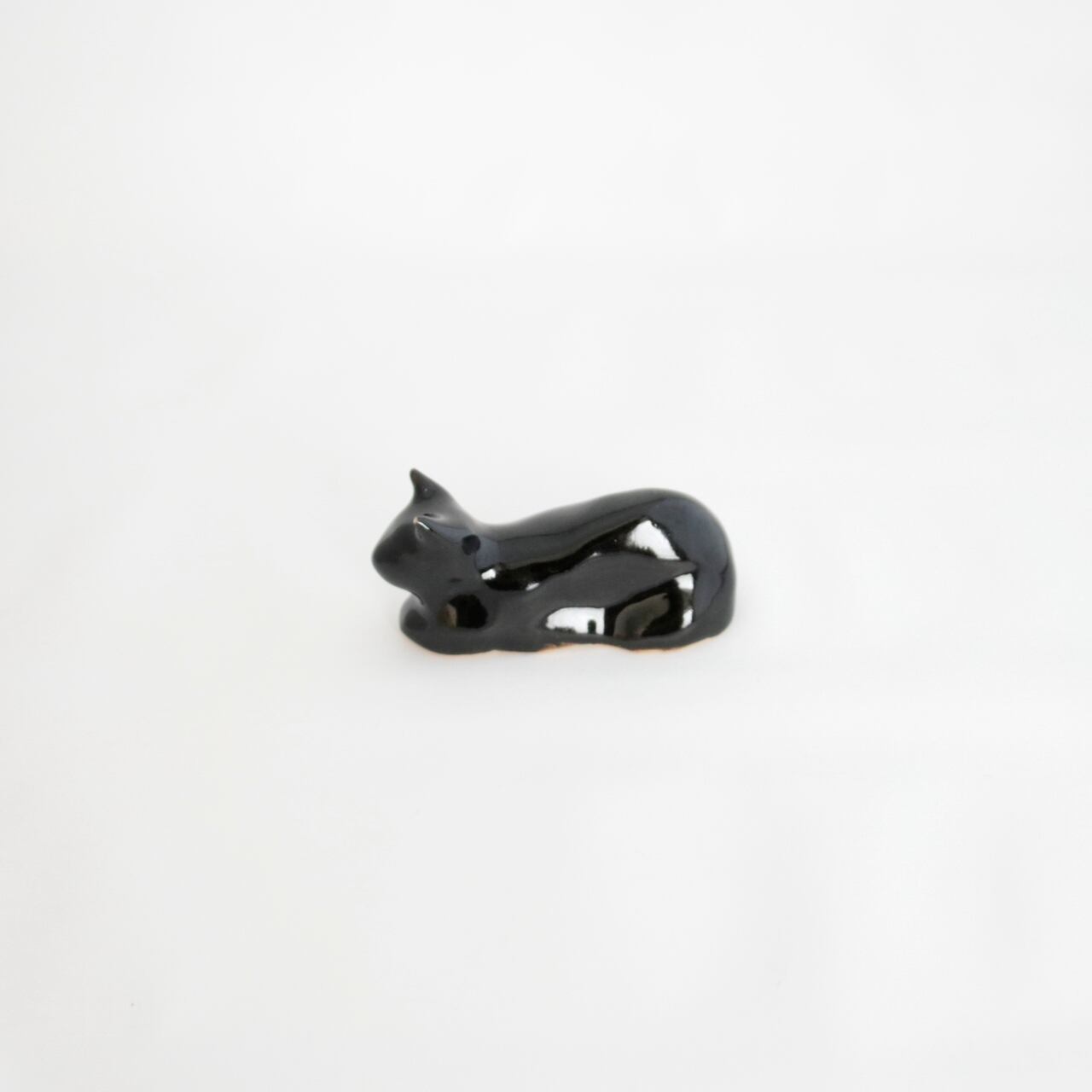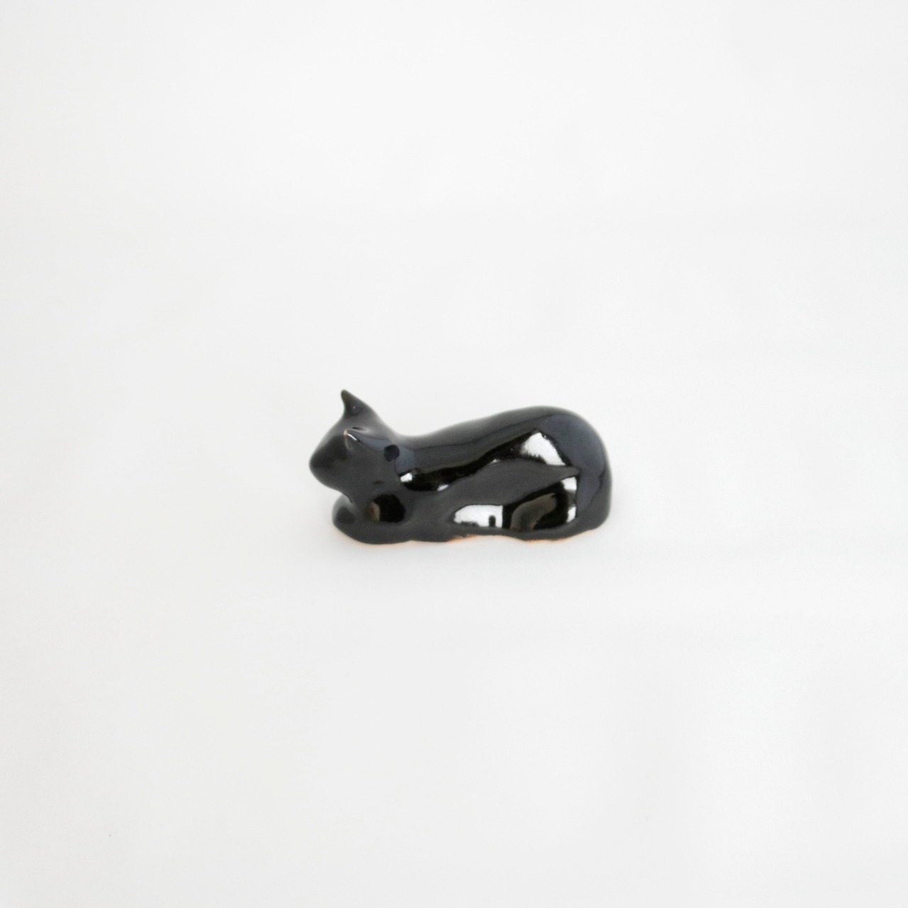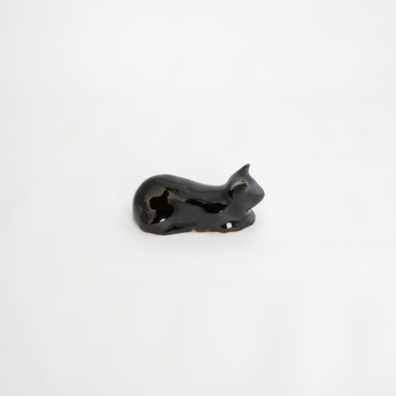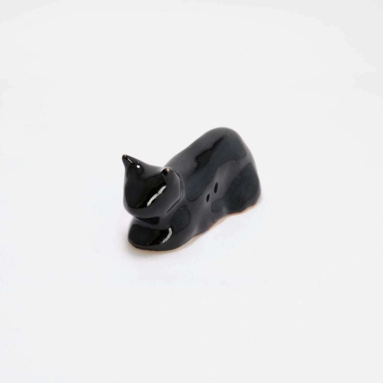 座る姿勢を手捻り、つやを黒天目釉で表現しました。