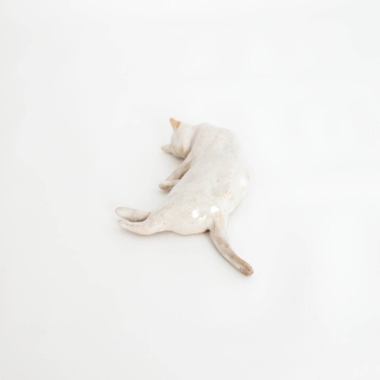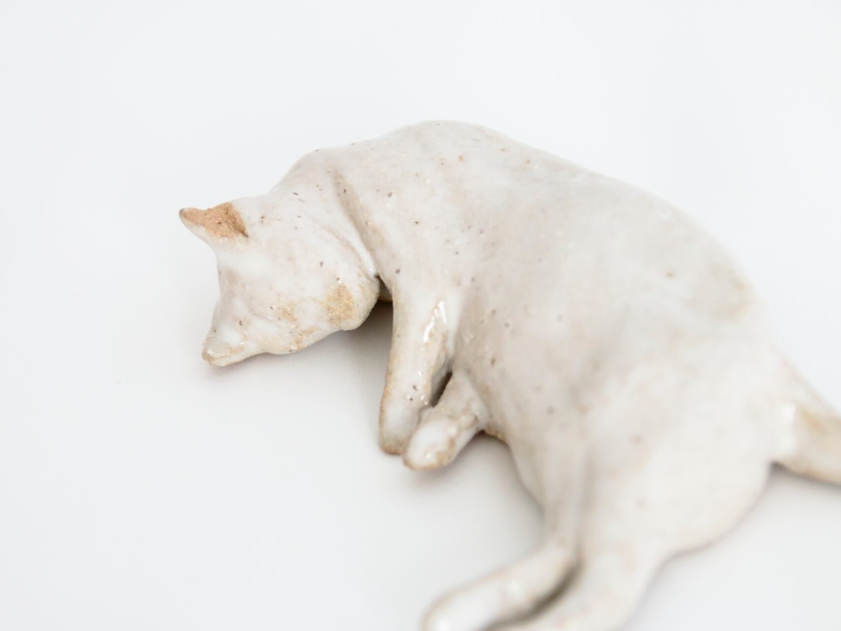 眠り姿勢を手捻り、まだらな白模様を赤土に白萩釉で表現しました。