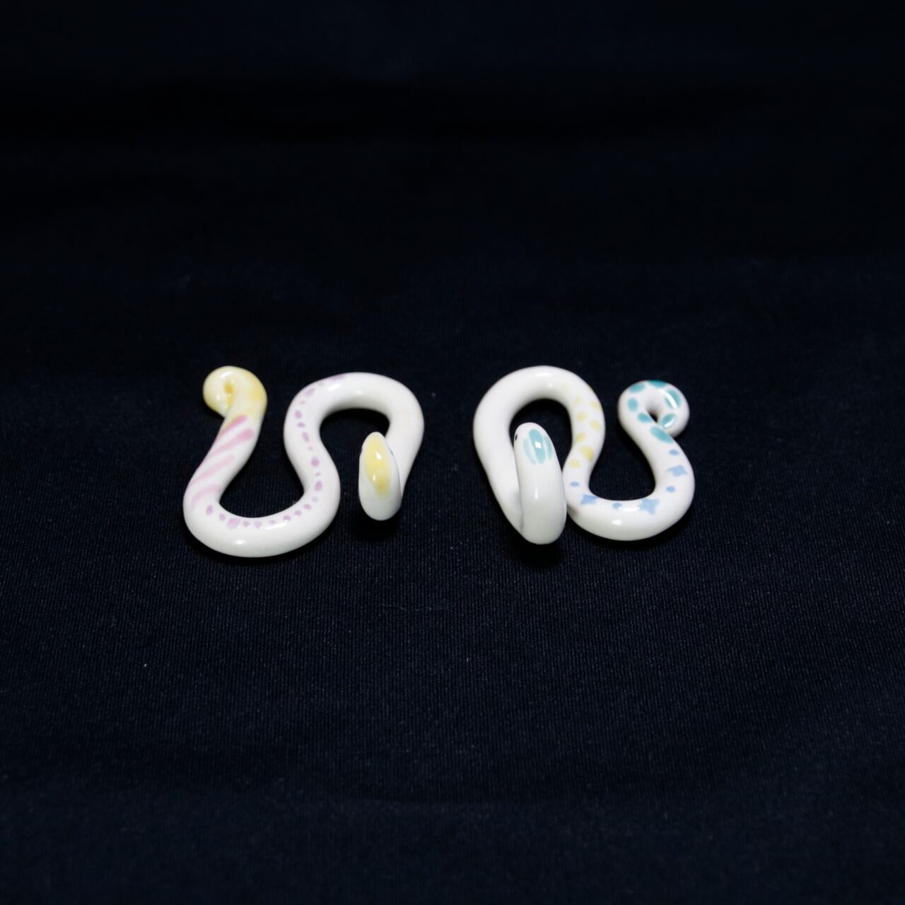 2025年の干支、巳の置物。寒色系と暖色系の揃いです。